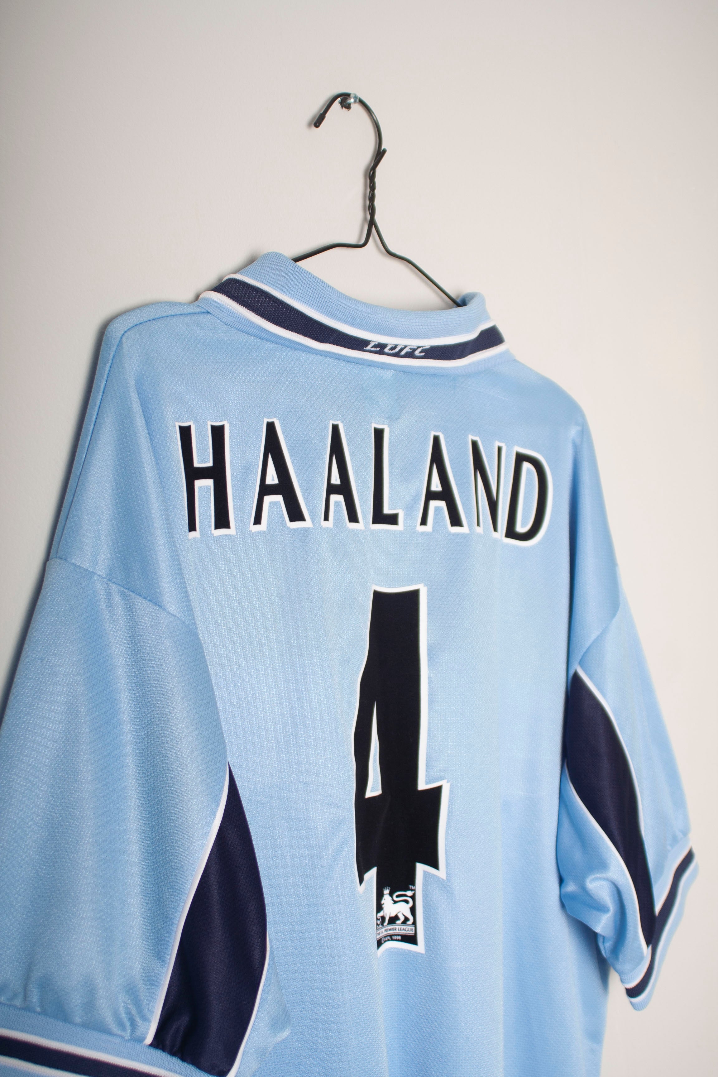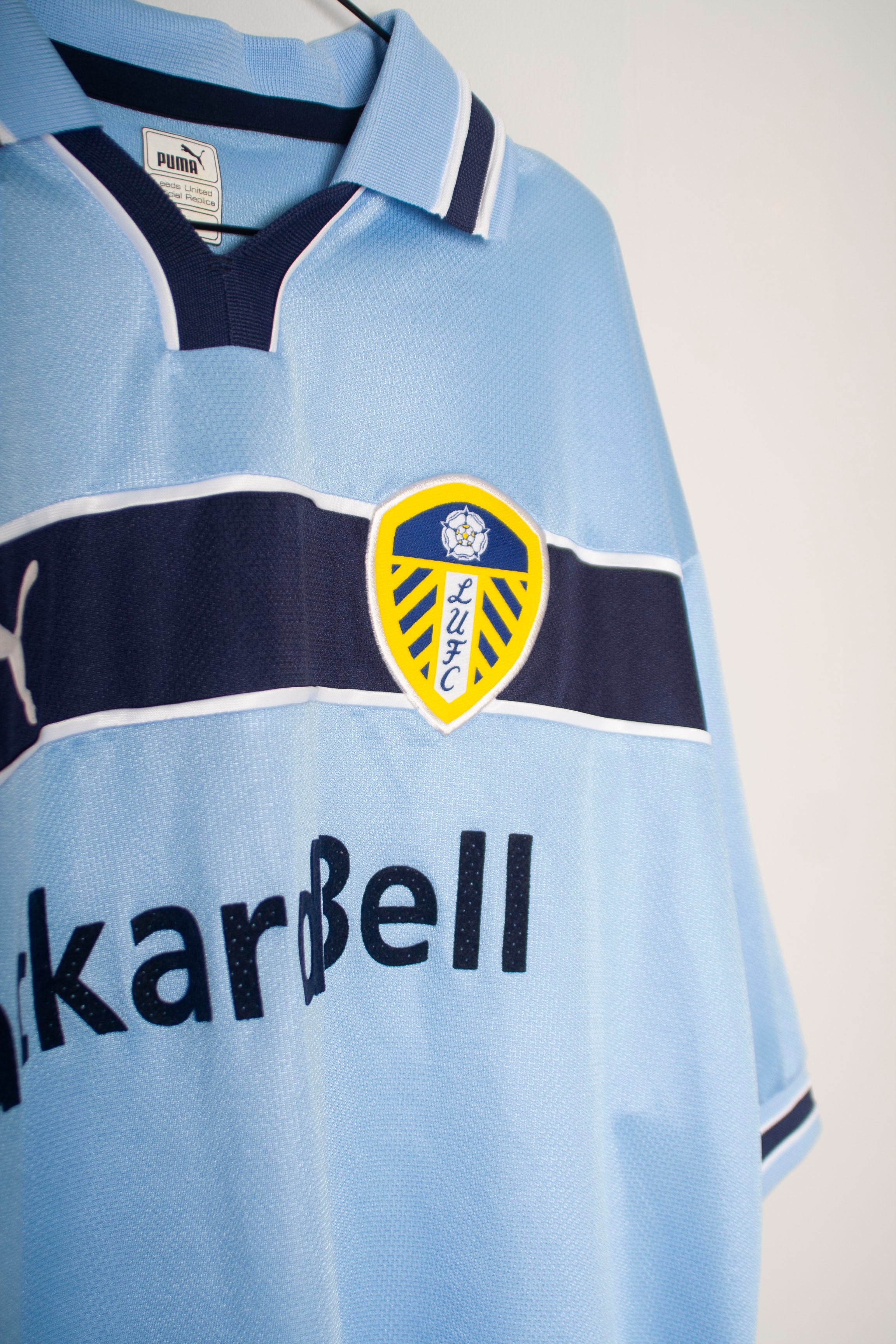 Celebrate Leeds United's memorable 1999/00 season with this classic Puma away football shirt, featuring 'Haaland' and the number 4 on the back. This jersey showcases a distinctive light blue design with navy and white accents, reflecting the club's traditional colors. The shirt prominently displays the official Leeds United crest on the chest, alongside the Puma logo and the Packard Bell sponsorship. This vintage piece is a must-have for dedicated fans and collectors, commemorating Alf-Inge Haaland's contributions during a standout season.
