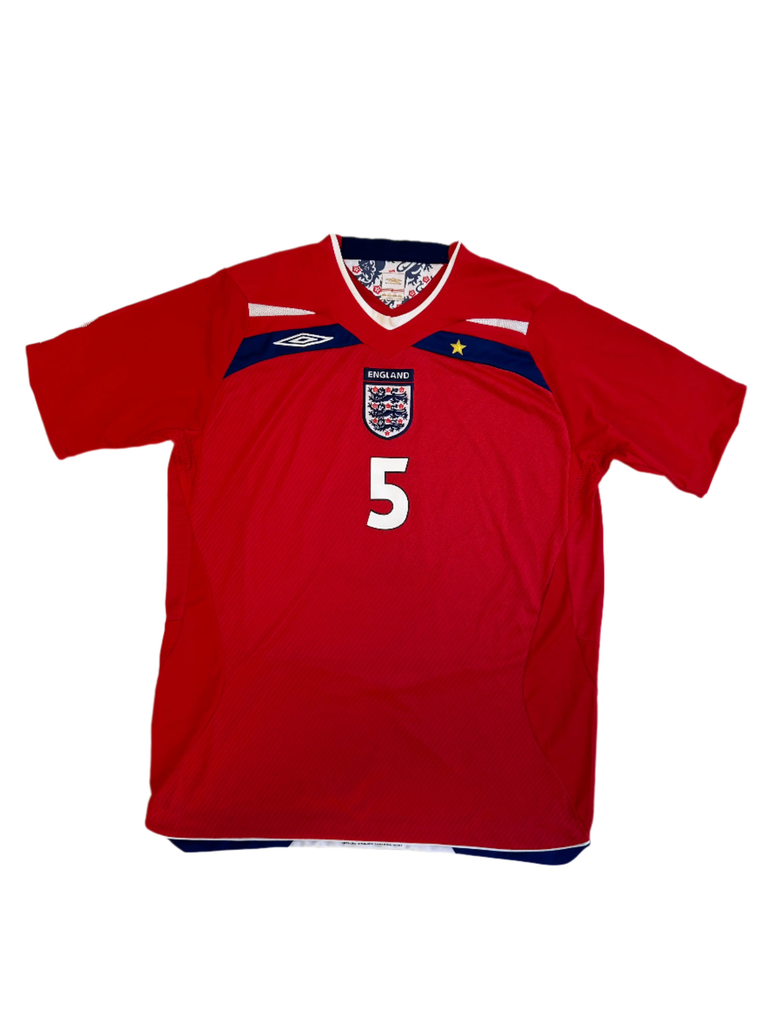 This away kit features a bold red design with a subtle graphic pattern across the chest, reflecting a modern twist on England's traditional colors. Lescott’s number 15 is prominently featured on the back, making this jersey a standout choice for fans of the powerful defender. The England crest and Umbro logo are proudly displayed, symbolizing a legacy of excellence and commitment.